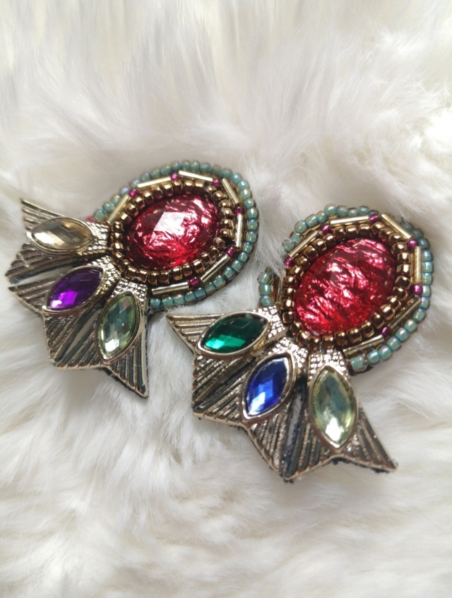ホログラム風の鮮やかな赤のビジュー周りを様々なビーズで刺繍し彩ったピアス。 メタリックなヒレ状のモチーフが存在感マシマシに。 刺繍なので軽く、裏に合皮を貼っているため安定感のあるつけ心地。 縦4.5cm ベース横幅3.5cm ■ 発送・注文に関する情報や注意事項 ・ご注文後、通常4日以内に発送致します。 ■ その他の情報や注意事項 ・全て手作りの商品であるため、多少の個体差がある場合があります。 お問い合わせはショップのお問い合わせページよりお願い致します