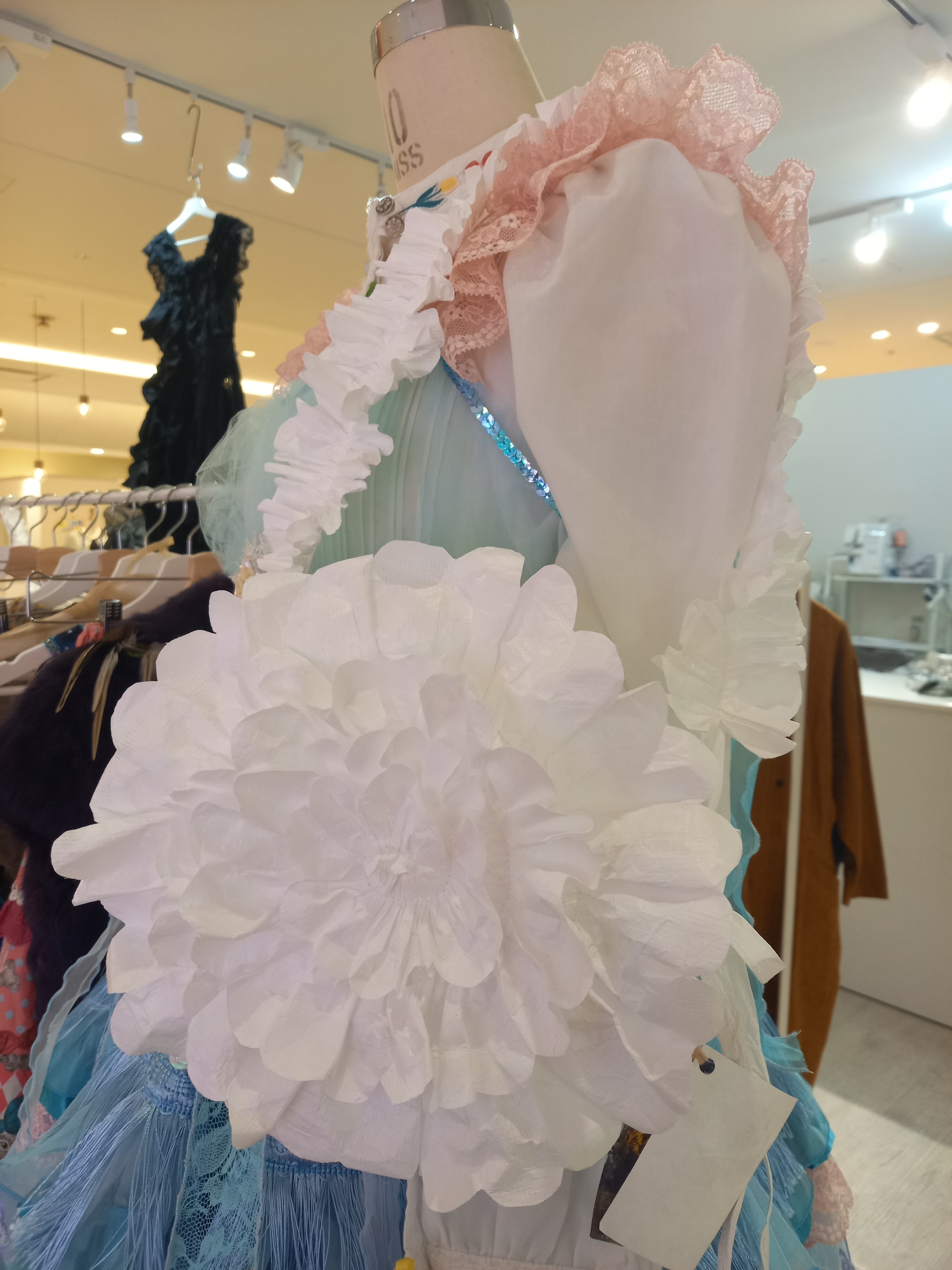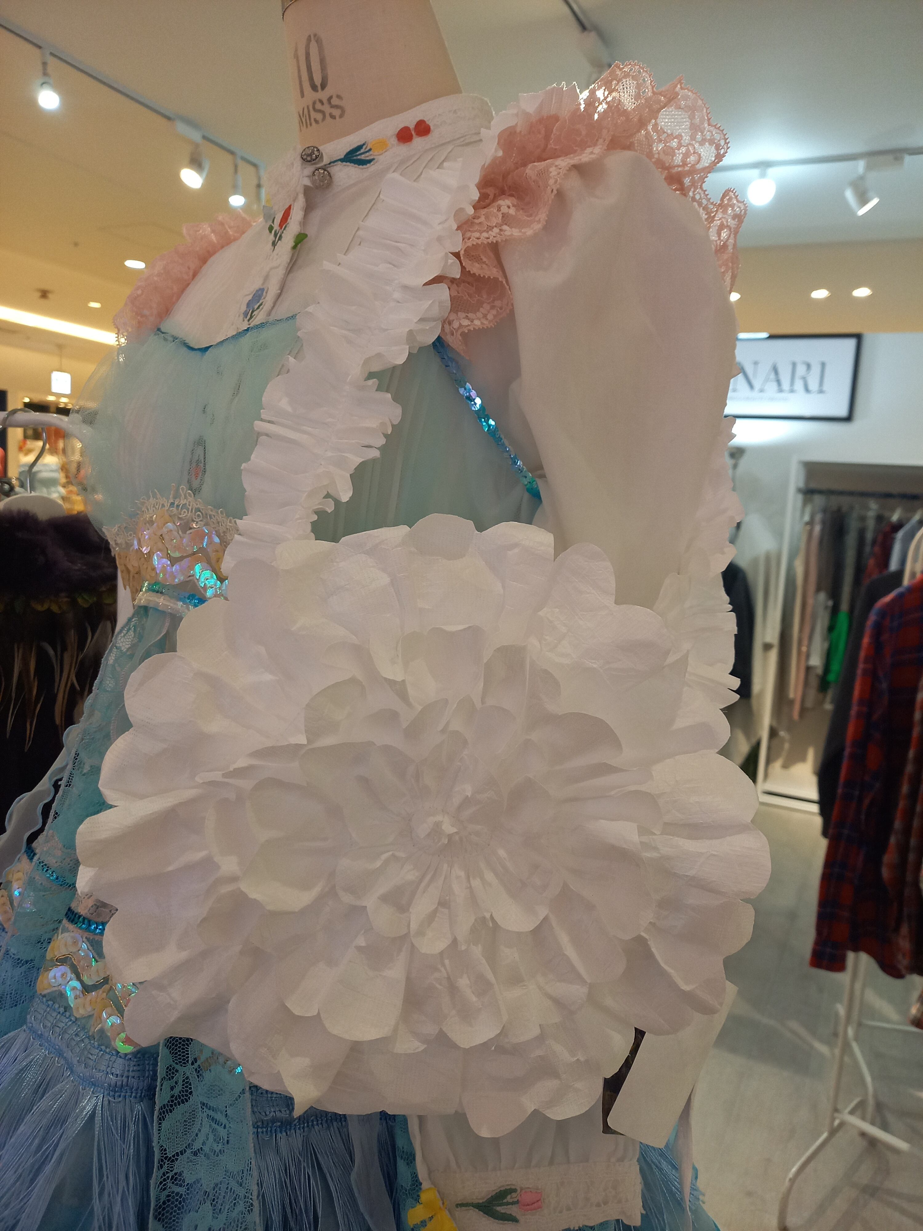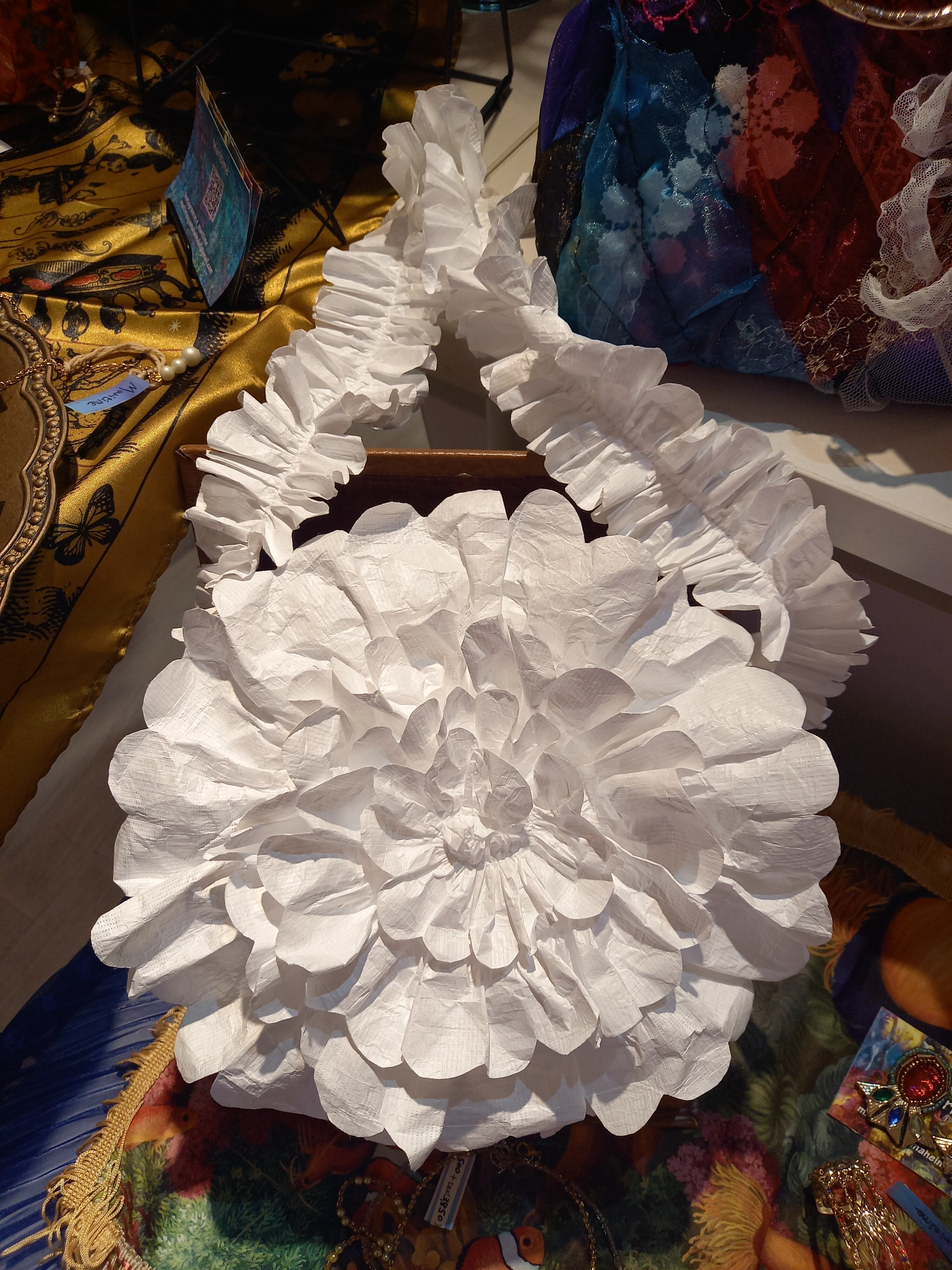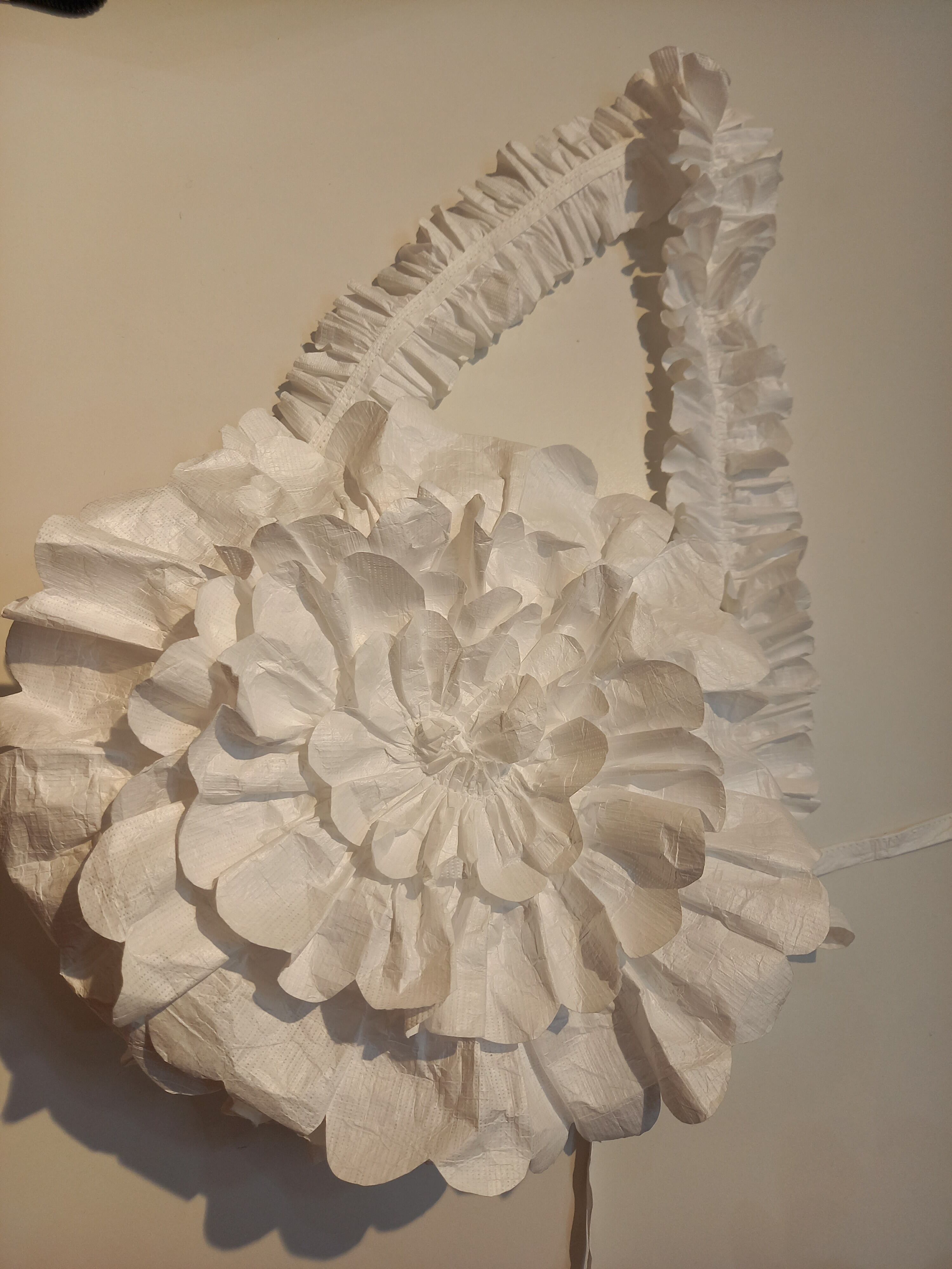 タイベックという防護服にも使われる水も弾く不織布を使用して花のようにフリルで飾った丸型ショルダーバッグ。