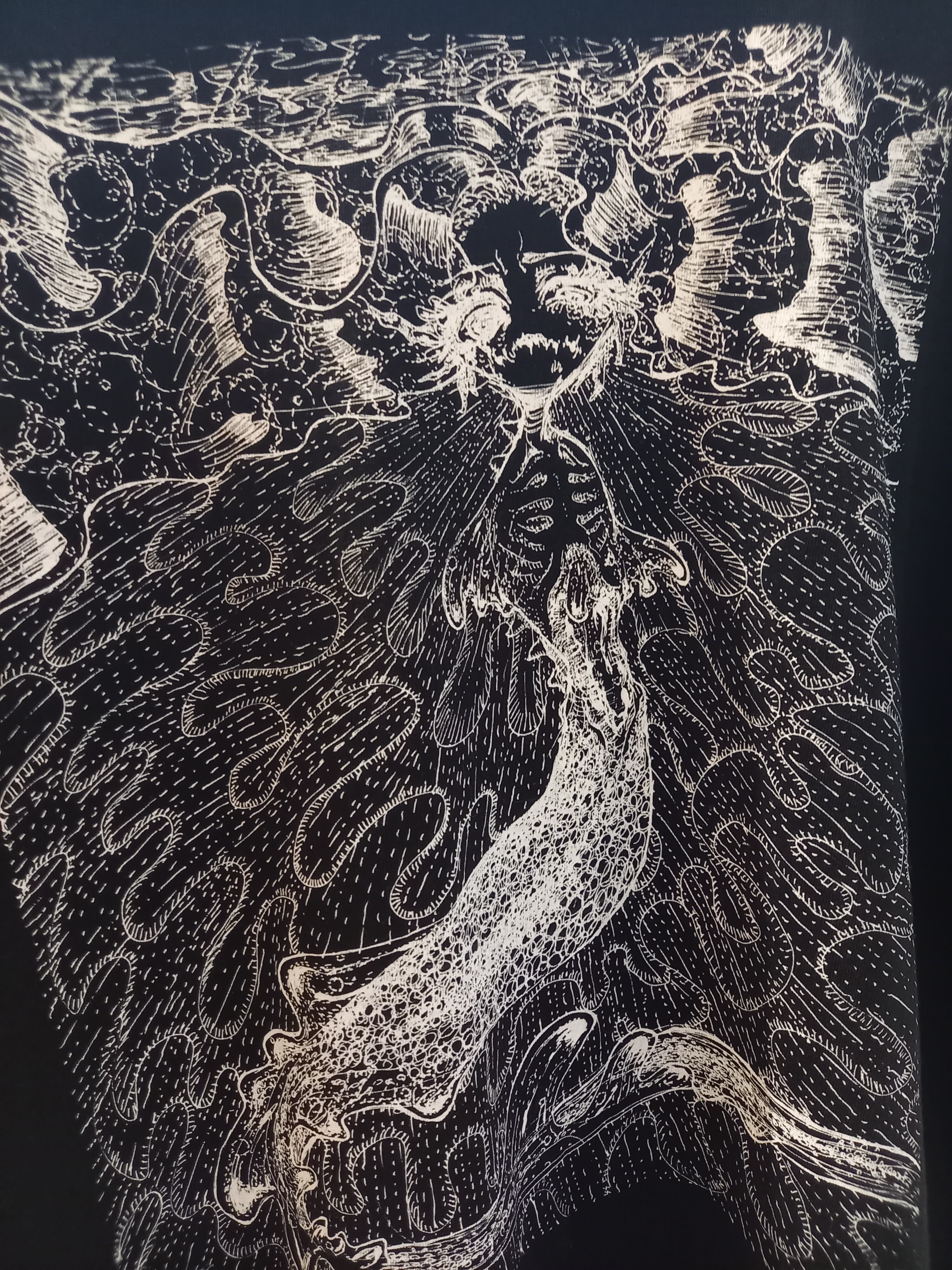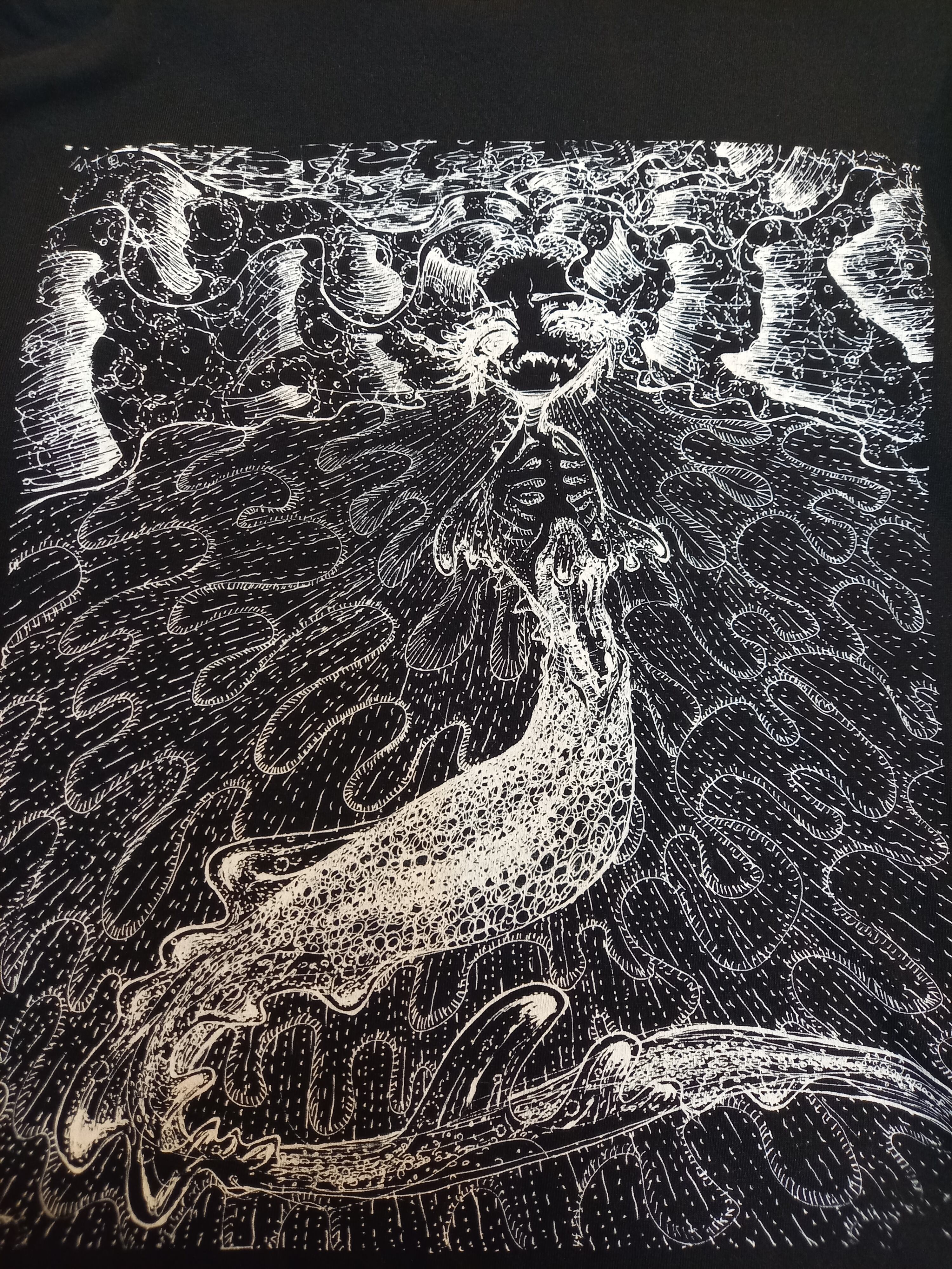 海洋の驚異を怪物として認識してペン画で描いたイラストを白インクに反転。