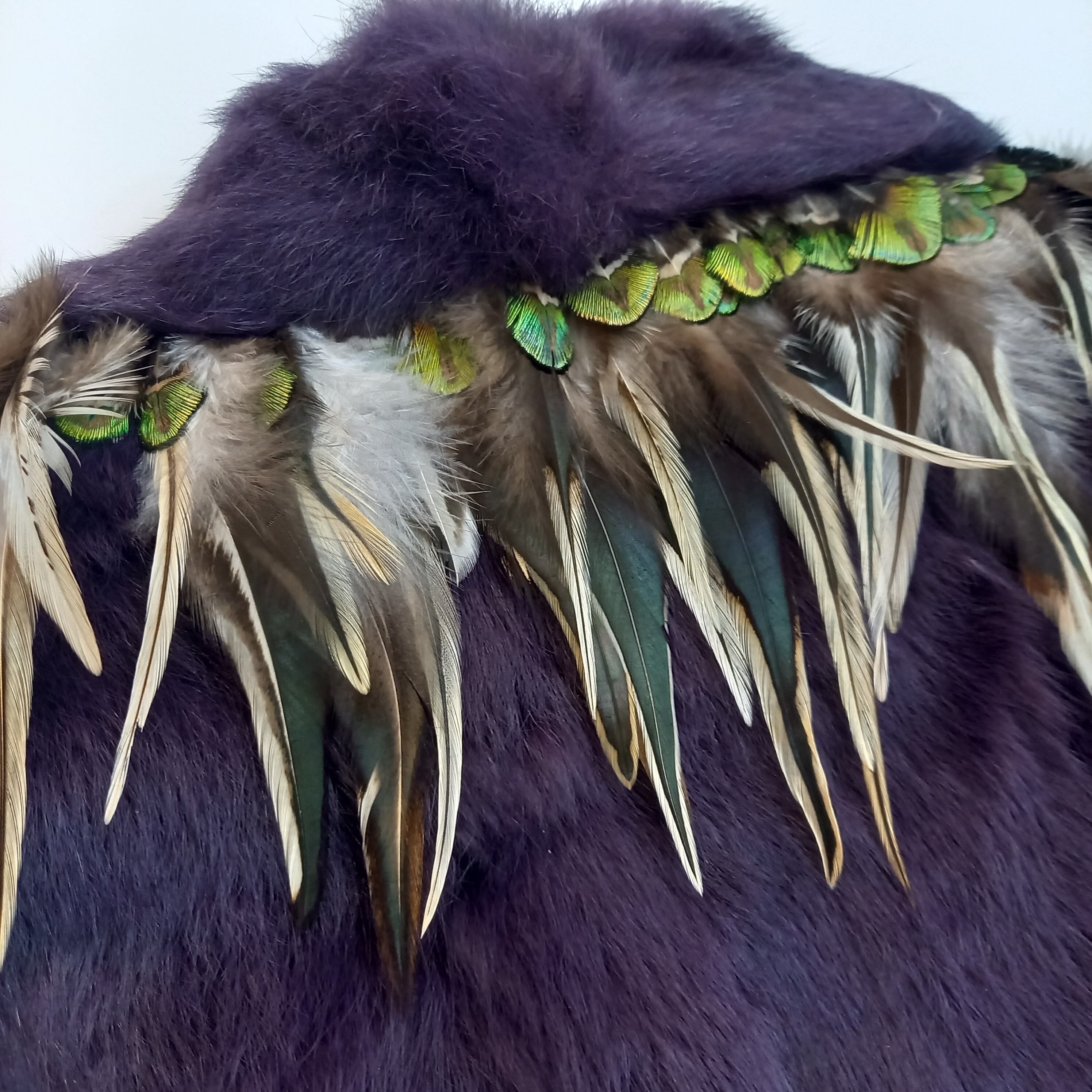 魔女の象徴ともされるうさぎの紫色のファーと孔雀のような緑の羽根がラグジュアリーな雰囲気。