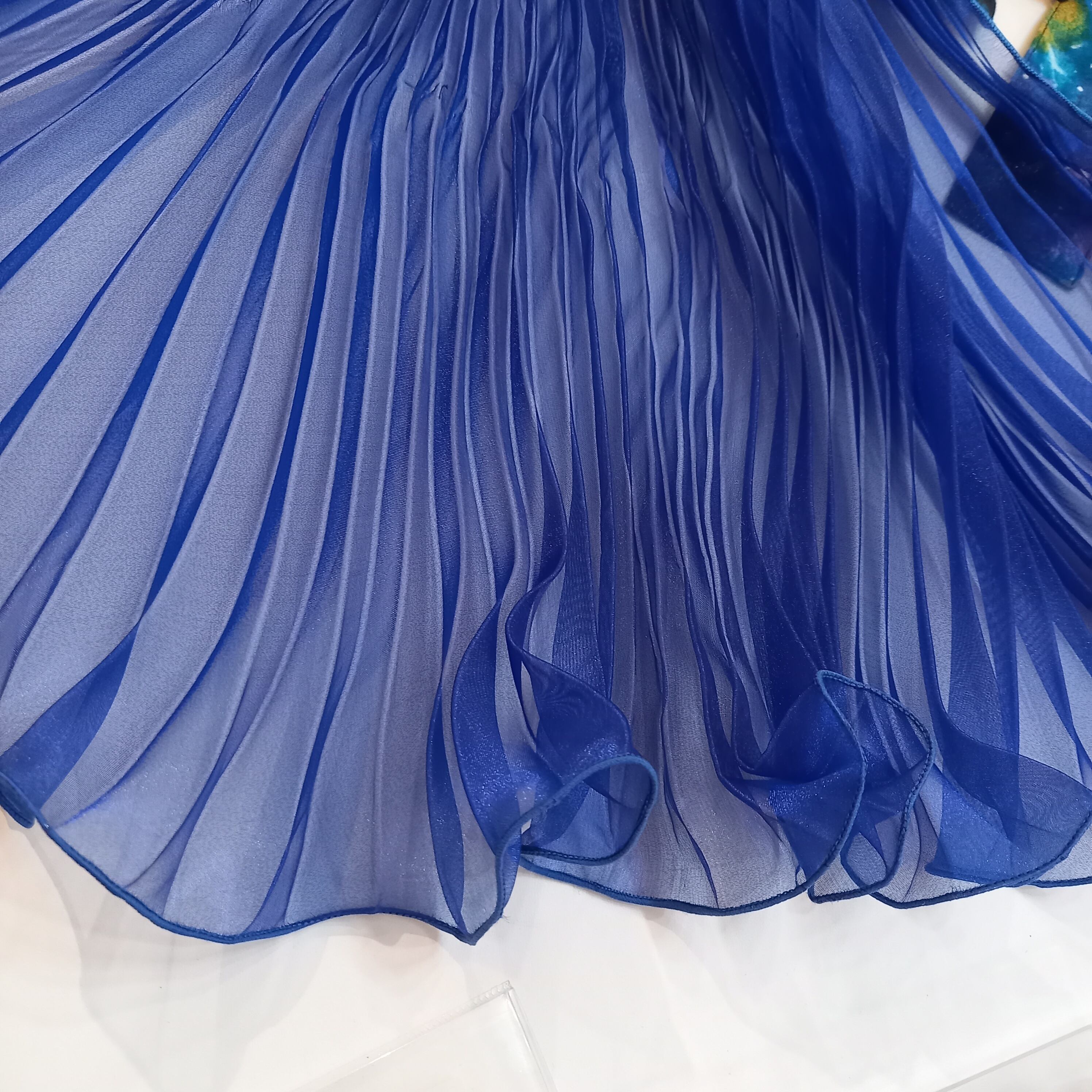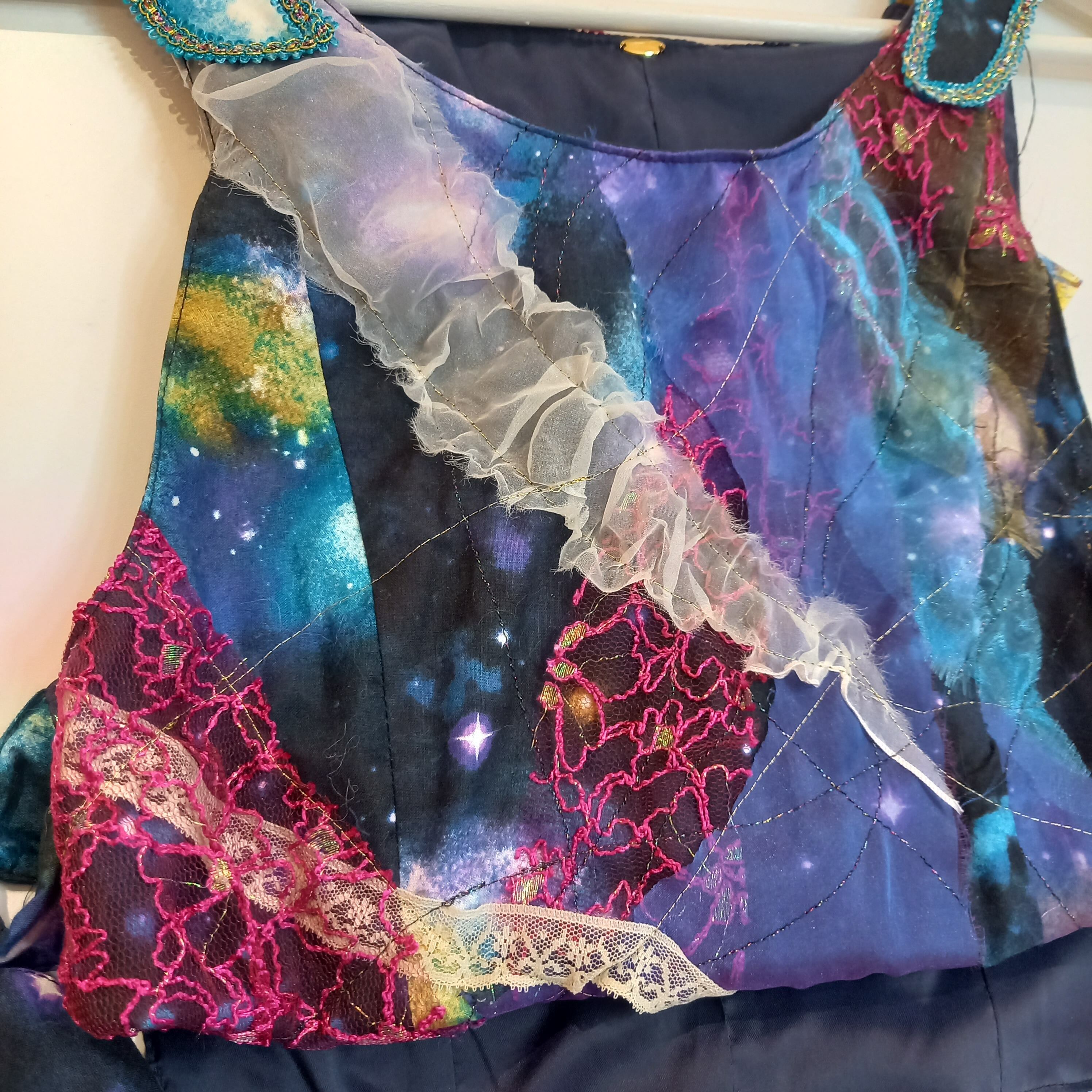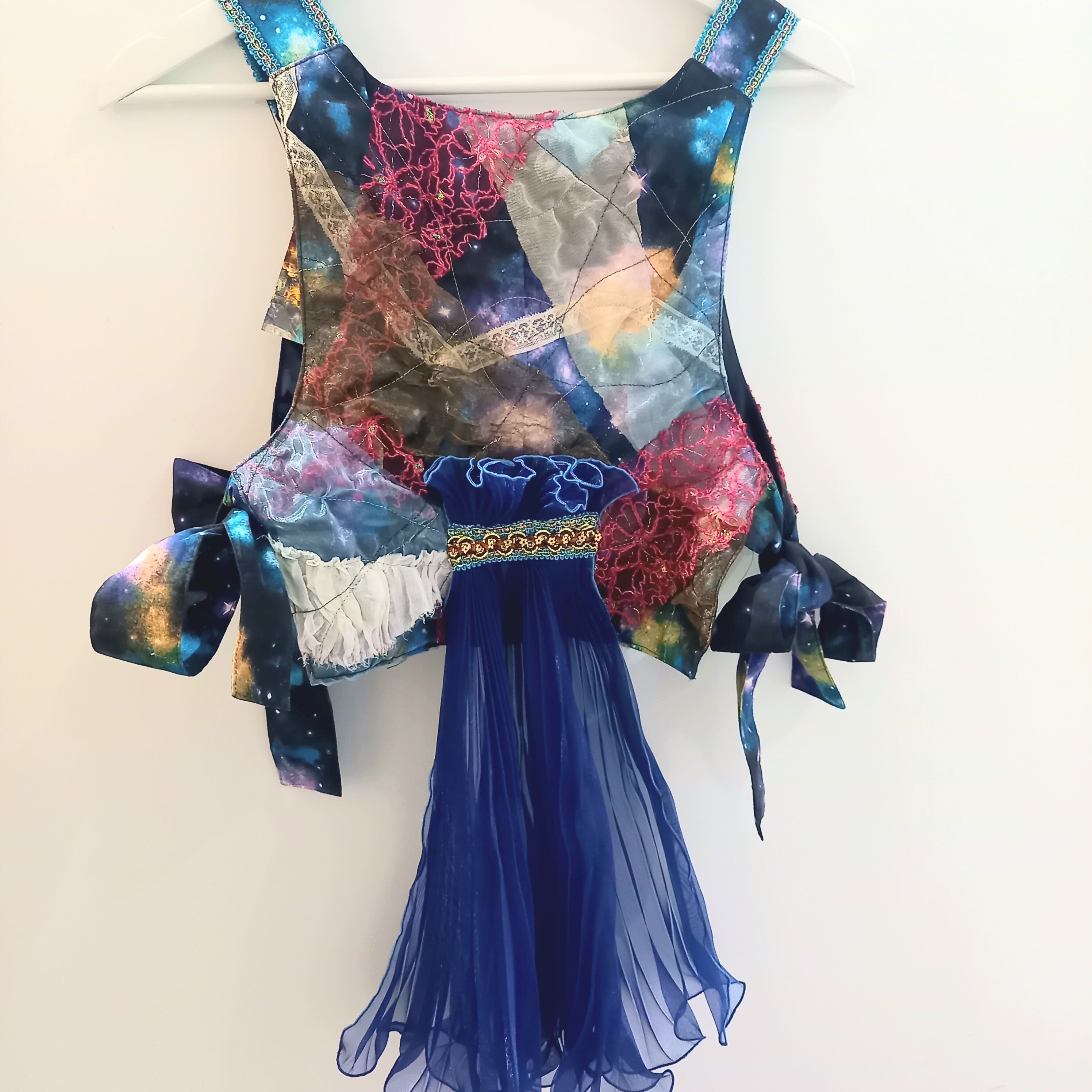 宇宙柄をベースに様々な質感の生地を配置しキルティング加工したビスチェ。